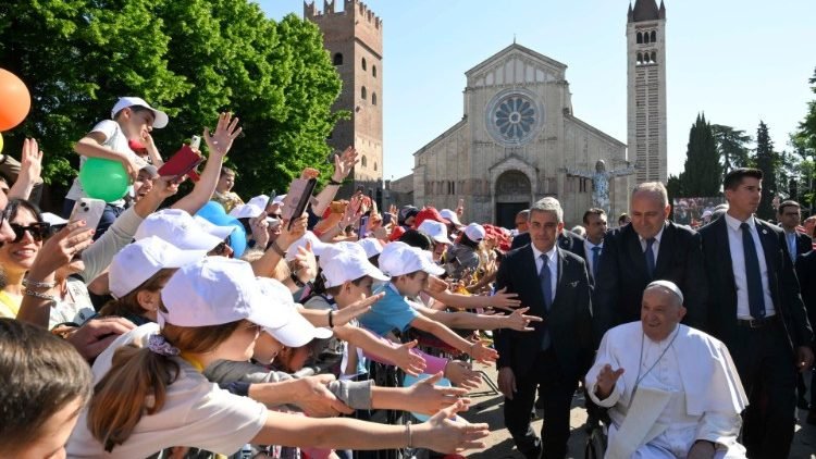 Encountering children in the Italian city of Verona, Pope Francis urges them to be empowered by the joy of Jesus’ love and friendship to go against conventional thinking, to pursue what is good, and to work toward peace.